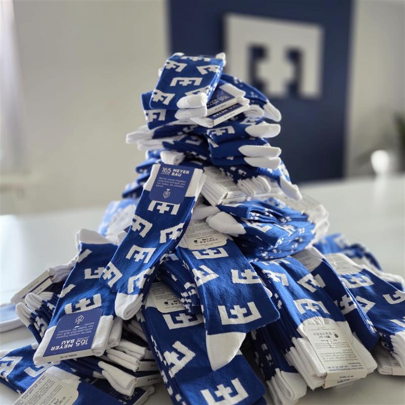 Schon Ende August haben wir dieses Jubiläum mit einem großen Sommerfest für alle Mitarbeitenden und ihre Familien gefeiert, aber weil bei unseren Projekten nichts ohne uns läuft, gab es heute noch eine kleine Überraschung: coole Socken im Meyer-Design.