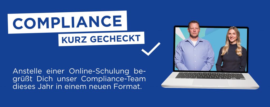 Unser Compliance-Team begrüßt Dich in diesem Jahr in einem neuen Format. Statt einer Online-Schulung mit anschließendem Test haben sie das untenstehende Video für Dich vorbereitet, indem sie Dir anhand von praktischen Beispielen erklären, wie wir uns in bestimmten Situationen compliancekonform verhalten.