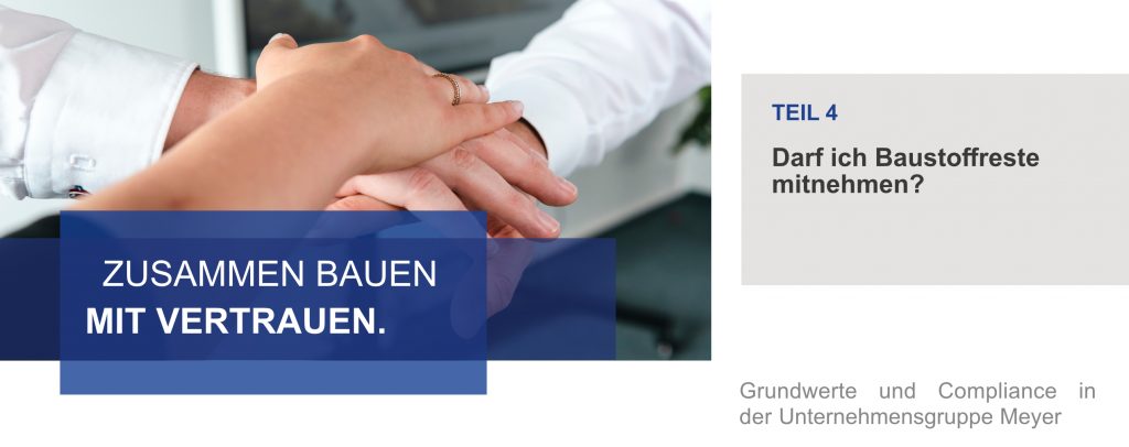 Unsere Compliance-Richtlinien definieren auch den Umgang mit Eigentum und Vermögen unseres Familienunternehmens. Die Verwendung ist ausschließlich für Unternehmenszwecke vorgesehen, sofern keine sonstige ausdrückliche Erlaubnis der Geschäftsführung vorliegt. Das gilt auch für Baumaterialien, die auf den Baustellen bereits im Bauschuttcontainer gelandet sind oder „übrig“ sind, weil z. B. eine Palette Steine zu viel bestellt wurde.