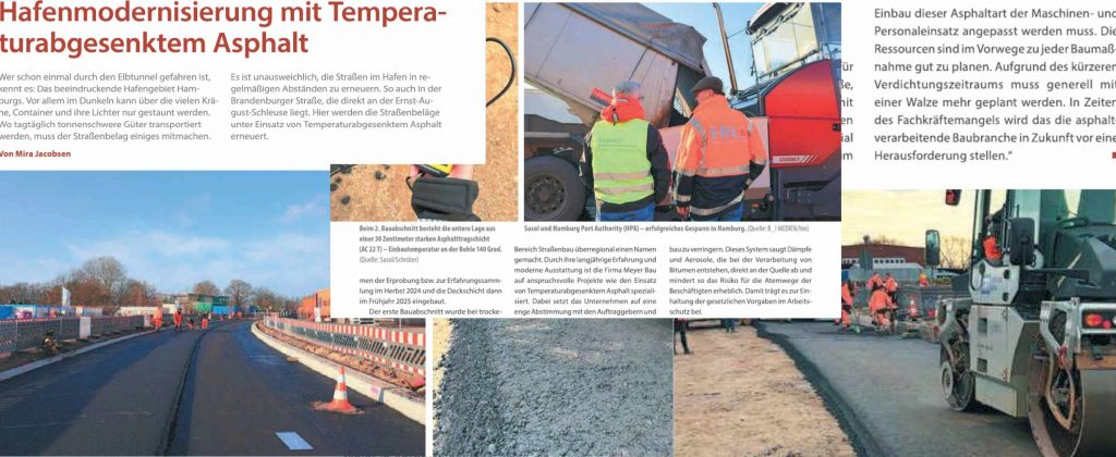 Im Auftrag der Hamburg Port Authority (HPA) haben unsere Kolleg*innen von Meyer Tiefbau in der Brandenburger Straße in Hamburg ein zukunftsweisendes Bauvorhaben erfolgreich umgesetzt: den Einbau von temperaturabgesenktem Asphalt. Dieses Projekt ist nicht nur ein technischer Meilenstein, sondern wurde auch in der aktuellen Ausgabe 05/2025 der Fachzeitschrift 𝒂𝒔𝒑𝒉𝒂𝒍𝒕 als Praxisbeispiel für innovative Straßenbautechnologie aufgegriffen..