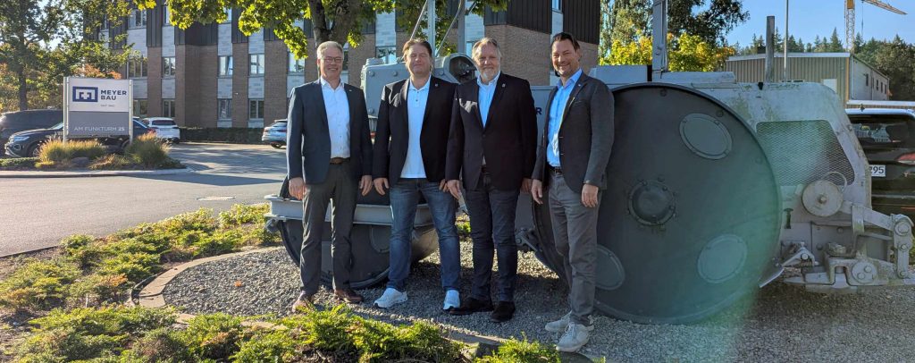 „Uns verbindet nicht nur die regionale Nähe, wir teilen auch Werte wie Teamgeist, Leidenschaft und Zusammenhalt. Als Partner für Infrastruktur freuen wir uns auf diese starke Partnerschaft“, erklärt unser geschäftsführender Gesellschafter, Per Carsten Meyer. Beim Fototermin vor unserer historischen Walze an unserem Standort in Uelzen waren sich Michael Bombeck (Geschäftsführer Meyer Hochbau), Raphael Marquardt (Vorsitzender LSK Hansa), Kay Kirchmann (2. Vorsitzender LSK Hansa) und Per Carsten Meyer einig: Für den Oberliga-Fußballklub gibt es mittelfristig nur einen Weg – nach oben!