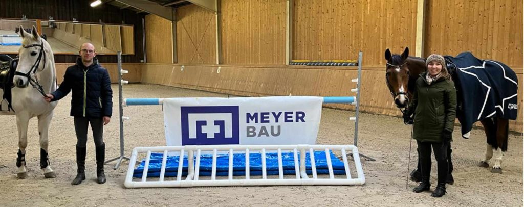 Unser Tiefbau-Kollege David Stephan vom Erd- und Grundbau in Falkensee hat die Reitsportsparte des Vereins ins Leben gerufen und ist ihr Vorsitzender. Die Springreiter des SV Papitz 09 trainieren regelmäßig auf der Reitanlage unseres Kollegen. Um erfolgreich in die kommende Turniersaison zu starten, steht ihnen nun dank unseres „MEYER HELDEN“-Programms für das Springtraining ein Hindernis mit Wassergraben zur Verfügung. So wird die blaue Matte genannt, die unter einen Sprung gelegt werden kann oder – wenn sie komplett auf 3 x 3 Meter ausgebreitet wird – eine Art Weitsprung darstellt.