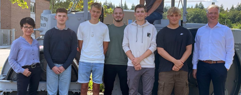 Jetzt geht’s los – am 1. August hat das neue Ausbildungsjahr begonnen und wir können fünf Azubis begrüßen, die in unserem Familienunternehmen in ihr Berufsleben starten. Bryan Brüggeman absolviert bei uns eine Ausbildung zum Maurer. „Ich wünsche mir, dass wir uns alle gut verstehen werden und Spaß zusammen haben“, erzählte er an seinem ersten Tag bei uns. Auch Michel Kerstholt macht eine Ausbildung zum Maurer in unserem Unternehmen „Ich gehe mit den Erwartungen an mich selbst in die Ausbildung, gute Leistungen in der Praxis zu erbringen und in der Berufsschule sehr gut zu sein. Dabei hoffe und baue ich auf die Unterstützung durch zahlreiche erfahrene Kolleg*innen“, erklärte unser neuer Azubi. Tom Niklas Anderfuhr wird Meyer Tiefbau als Auszubildender zum Tiefbaufacharbeiter unterstützen und möchte in den kommenden Jahren an alle Tätigkeiten dieses Berufs herangeführt werden. „In meiner Freizeit spiele ich Handball und bin in der Freiwilligen Feuerwehr aktiv“, verriet er. Auch Florian May, der bei uns seine Ausbildung zum Fachinformatiker für Systemintegration beginnt, freut sich darauf, während der kommenden drei Jahre viel Neues zu lernen und sein bestehendes Wissen zu vertiefen. „Ich spiele Tischtennis und Volleyball in Westerweyhe“, erzählte er. Dominik Weber ist ebenfalls sehr sportlich und betreibt gerne Fitness in seiner Freizeit. In unserem Unternehmen beginnt er seine Ausbildung zum Industriekaufmann. „Von der Ausbildung erwarte ich, Einblicke in verschiedensten Abläufen des Unternehmens zu bekommen, sodass ich sie anschließend selbstständig anwenden kann“, sagte er ehrgeizig.
