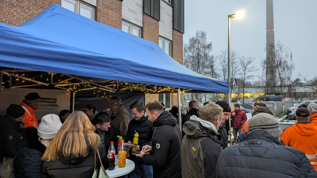 Am Nikolaustag hatte die Change-Gruppe einige Überraschungen organisiert. Die erste wartete gleich morgens auf einigen Schreibtischen: neue Thermobecher mit dem von der Gruppe entwickelten Meyer DNA-Logo und dem Slogan „Zusammen Bauen. Einander Vertrauen.“ Hunderte der neuen Becher haben sich in den vergangenen Tagen heimlich von Uelzen aus auf den Weg zu den Baustellen und den Standorten gemacht, damit möglichst jede/r Mitarbeitende pünktlich zum Nikolaus einen Becher erhält. Unsere Kolleg*innen, die krank oder in Kurzarbeit sind sowie die Kolleg*innen, die aufgrund des schlechten Wetters nicht auf die Baustellen konnten, bekommen ihre Becher nachgereicht. Die zweite Überraschung wartete am Nachmittag in Uelzen auf dem Parkplatz: Ein heißer Becher voll wärmendem Punsch und eine frisch gegrillte Bratwurst auf die Hand – was hier im ersten Augenblick nach Weihnachtsmarkt klingt, war eine von der Change-Gruppe geplante After-Work-Veranstaltung. Die Aktion war bis Mittwoch streng geheim. Nur eine Handvoll Personen war eingeweiht, sodass unsere gewerblichen Kolleg*innen erst bei der Rückkehr von den Baustellen auf den Betriebshof den „Bratwurstpavillon“ entdeckten. Natürlich waren aber auch alle Büroangestellten und die Kolleg*innen aus der Werkstatt und dem Lager aus Uelzen herzlich willkommen.