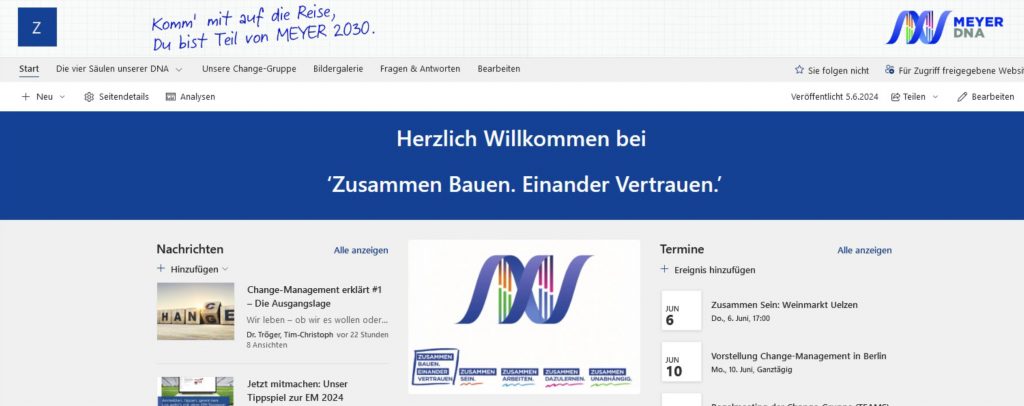 Wie Du bereits im OE-Newsletter Nr. 3 erfahren hast, wird unser Meyer-Intranet (auf dem SharePoint) Stück für Stück um viele Funktionen und Inhalte erweitert. Brandneu ist die Meyer-DNA-Seite. Hier findest Du viele Informationen rund um das Thema „Zusammen Bauen. Einander Vertrauen“ gebündelt an einem Ort. Zum Beispiel werden die vier Säulen unserer DNA – ,Zusammen Sein‘ ,Zusammen Arbeiten‘, ,Zusammen Dazulernen‘ und ,Zusammen Unabhängig‘ – vorgestellt. Zudem gibt es eine Bildergalerie, eine Übersicht mit Kontaktdaten unserer Kolleg*innen aus der Change-Gruppe und einen Bereich, in dem häufig gestellte Fragen beantwortet werden. Außerdem gibt es einen Nachrichtenbereich mit kurzen Beiträgen über das Change-Management sowie allen bereits erschienenen Blogbeiträgen über unsere Change-Gruppe, ihre Maßnahmen und die Meyer-DNA. Wenn Du wissen willst, wann die nächste Aktion stattfindet oder wann sich die Gruppe trifft, dann wirf einen Blick auf den Kalender mit allen Change-Terminen.