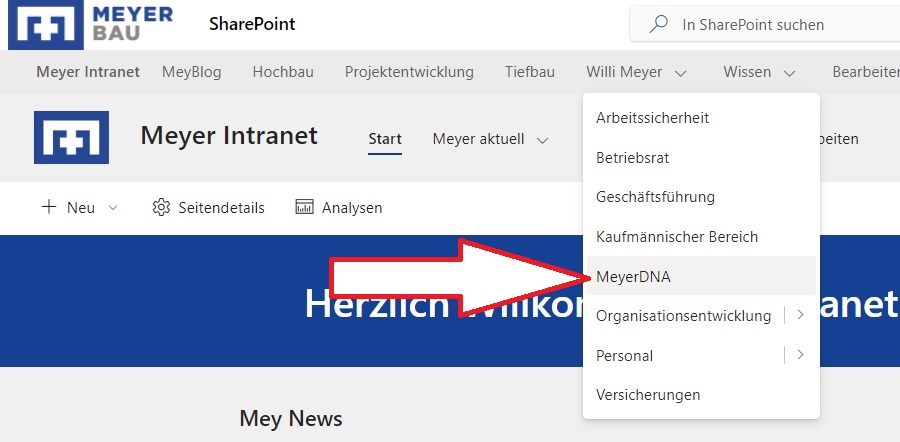 Du findest die Meyer-DNA im Intranet im Menü rechts neben „Vorlagen/Dokumente“ und zusätzlich in der oberen Menüleiste, wenn Du mit der Maus auf „Willi Meyer“ gehst. Es öffnet sich ein Dropdown-Menü und Du brauchst nur noch auf „MeyerDNA“ zu klicken (an fünfter Stelle von oben) und schon geht’s los.