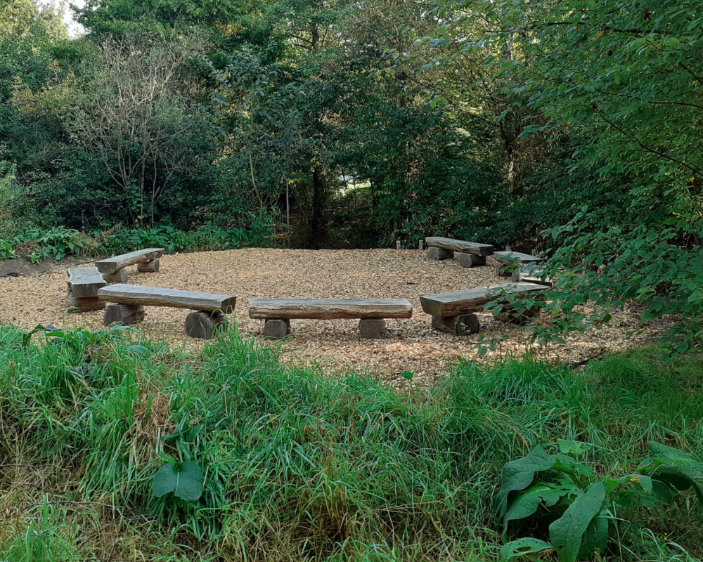 Zunächst wurde die etwa 70 qm große Fläche freigeschnitten und anschließend plan gemacht. Die Schüler*innen hatten zuvor den Platz für das Klassenzimmer ausgesucht. Anschließend wurde ein Mineralgemisch und ein Vlies verlegt, auf dem die Jungen und Mädchen Hackschnitzel verteilten, sodass ein ebener und haltbarer Untergrund entstand. Der Vater eines Schülers hatte zudem die schönen Bänke aus Holz angefertigt. Fördervereinsmitglieder, Lehrkräfte und Schüler*innen packten tatkräftig mit an, um das „Grüne Klassenzimmer“ zu errichten.