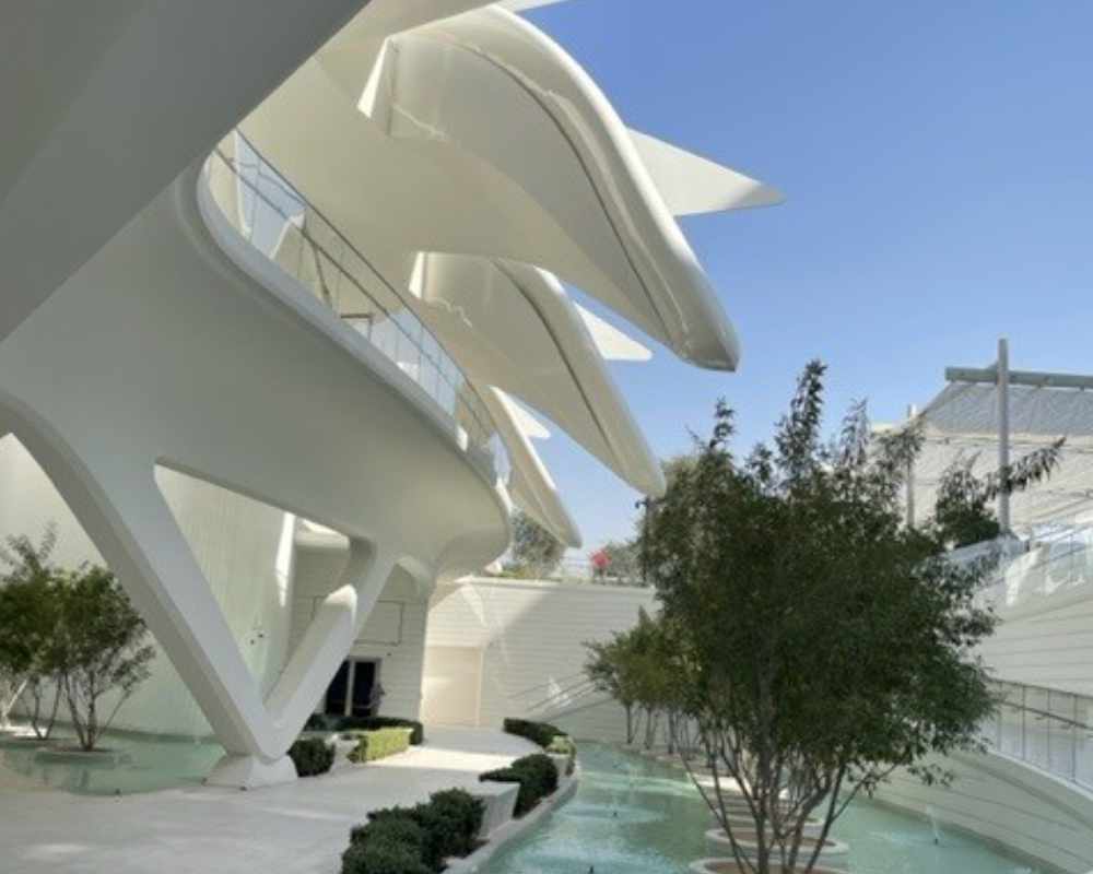 Weiterhin haben wir den Pavillon der Vereinigten Arabischen Emirate besucht, der optische Nachbau eines Falken im Fluge des berühmten spanischen Architekten Santiago Calatrava.
